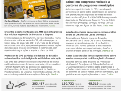 Evento realizado na terça (29/10), na Fatec Sorocaba, reuniu diretores das unidades locais do CPS, além de equipes da Cetec, Cesu, DI, Ugaf, UIE, URH e UP. Trata-se do primeiro encontro de uma série, que […]