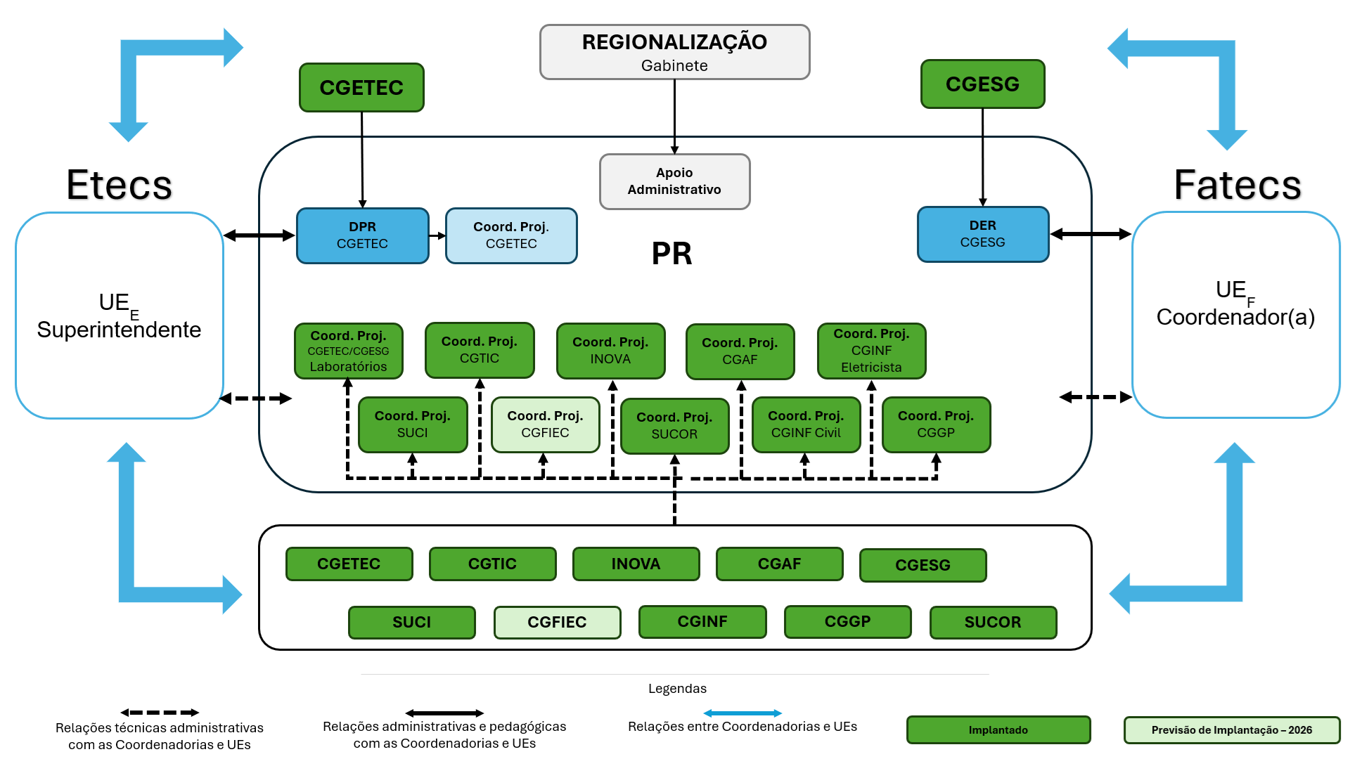 Inicialmente focado em infraestrutura, o Projeto de Regionalização expandiu sua atuação nos Polos Regionais (PRs) em 2019, com a implantação dos Professores Coordenadores de Projeto – Gestores das Divisões Educacionais Regionais (DERs) das Fatecs do Ensino Superior (CGESG); dos processos da Gestão Administrativa e Financeira (CGAF); de Gestão de Pessoas (CGGP); de Infraestrutura (CGINF), da Superintendência de Correição (SUCOR), da Coordenadoria Geral de Tecnologia da Informação e Comunicação (CGTIC) e, a partir de 2025, da Assessoria de Inovação Tecnológica (INOVA) com um modelo de gestão dinâmico e prático, baseado nas experiências de coordenadorias do CPS e das UEs.